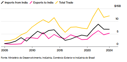 Em 2024, a Índia era o 13º maior parceiro comercial do Brasil