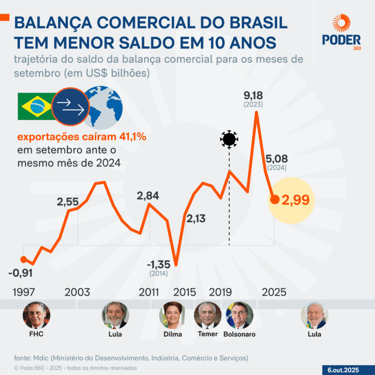 Parte da queda se deve à diminuição das exportações do Brasil aos Estados Unidos. Em agosto, houve queda de 18,5%. No mês passado, foi de 20,3%. A redução nas vendas coincide com o período do tarifaço. O presidente Luiz Inácio Lula da Silva (PT) conversou por telefone com Trump nesta 2ª feira (6.out) para tratar das taxas. Os 2 teriam concordado em se encontrar pessoalmente “em breve”. A reunião por videochamada durou 30 minutos e foi “amistosa”.