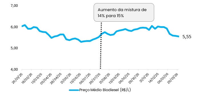 No entanto, quando se analisa a variação dos preços a partir da data do aumento da participação do biodiesel na mistura do óleo diesel B (de 14% para 15%), vigente a partir de 01/08/2025, o biocombustível se aproxima dos 1% de aumento.