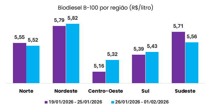 Os preços do biodiesel por região ficaram entre R$ 5,3231, praticados no Centro-Oeste, e R$ 5,8174, no Nordeste.