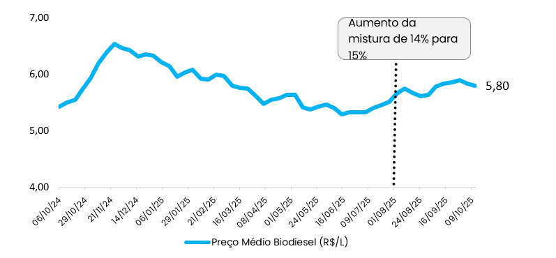 No entanto, quando se analisa a variação dos preços a partir da data do aumento da participação do biodiesel na mistura do óleo diesel B (de 14% para 15%), vigente a partir de 01/08/2025, o biocombustível se aproxima dos 5% de aumento. Em relação à média do mês de setembro, o preço do biodiesel caiu em outubro, até a última atualização da ANP.