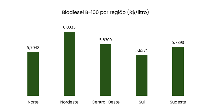 Os preços do biodiesel por região ficaram entre R$ 5,6571, praticados no Sul, e R$ 6,0335, no Nordeste.