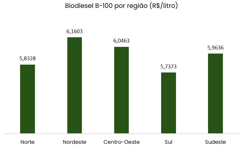 Os preços do biodiesel por região ficaram entre R$ 5,7373, praticados no Sul, e R$ 6,1603, no Nordeste.