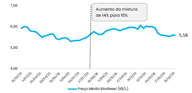 No entanto, quando se analisa a variação dos preços a partir da data do aumento da participação do biodiesel na mistura do óleo diesel B (de 14% para 15%), vigente a partir de 01/08/2025, o impacto no biocombustível é de um aumento de 1%.