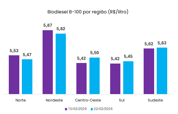 Segundo dados divulgados pela ANP, Agência Nacional do Petróleo, Gás Natural e Biocombustíveis, na última semana – de 16/02/2026 até 22/02/2026 – os preços do Biodiesel praticados no mercado nacional subiram, aproximadamente, 0,2% em relação à semana anterior. Na média Brasil, o produto negociado entre usinas e distribuidoras custou R$ 5,5820 por litro.