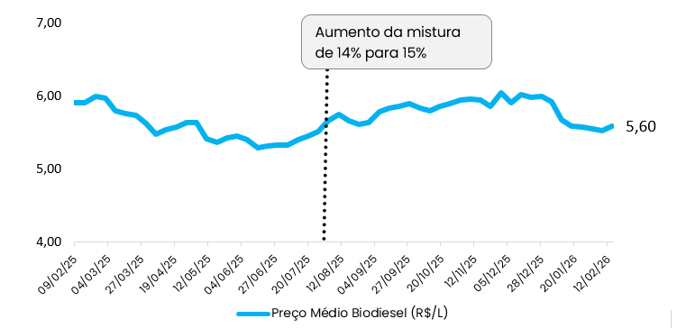 No entanto, quando se analisa a variação dos preços a partir da data do aumento da participação do biodiesel na mistura do óleo diesel B (de 14% para 15%), vigente a partir de 01/08/2025, o impacto no biocombustível é de um aumento de 1%.