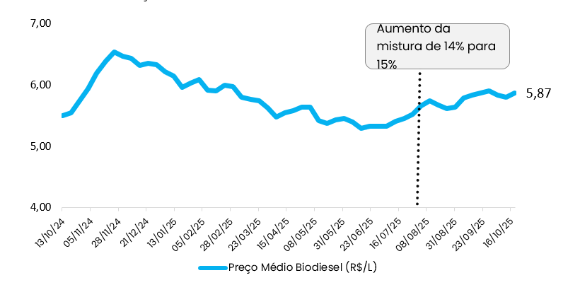 No entanto, quando se analisa a variação dos preços a partir da data do aumento da participação do biodiesel na mistura do óleo diesel B (de 14% para 15%), vigente a partir de 01/08/2025, o biocombustível se aproxima dos 6% de aumento. Em relação à média do mês de setembro, o preço do biodiesel caiu em outubro, até a última atualização da ANP.