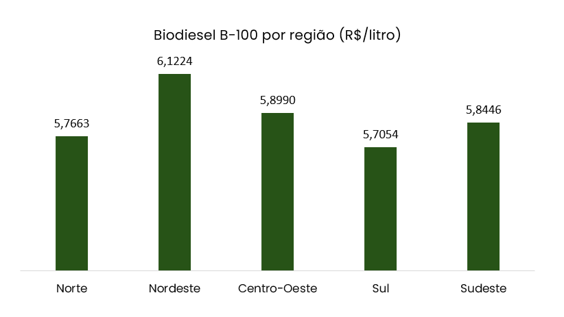 Os preços do biodiesel por região ficaram entre R$ 5,7054, praticados no Sul, e R$ 6,1224, no Nordeste.