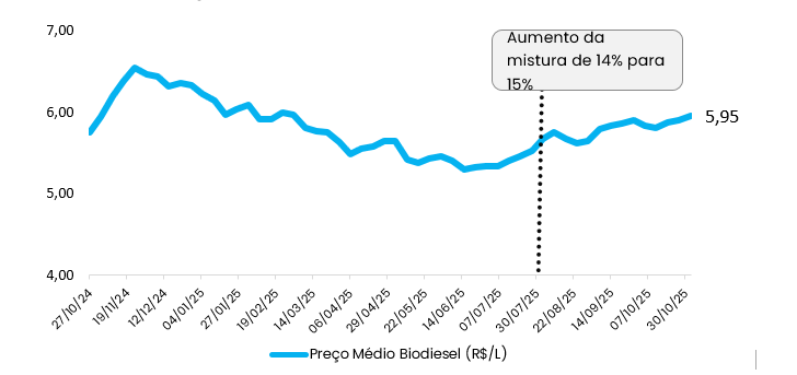 No entanto, quando se analisa a variação dos preços a partir da data do aumento da participação do biodiesel na mistura do óleo diesel B (de 14% para 15%), vigente a partir de 01/08/2025, o biocombustível se aproxima dos 8% de aumento. Em relação à média do mês de outubro, o preço do biodiesel subiu em novembro, até a última atualização da ANP.