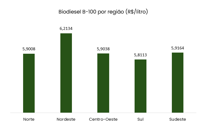 Os preços do biodiesel por região ficaram entre R$ 5,8113, praticados no Sul, e R$ 6,2134, no Nordeste.