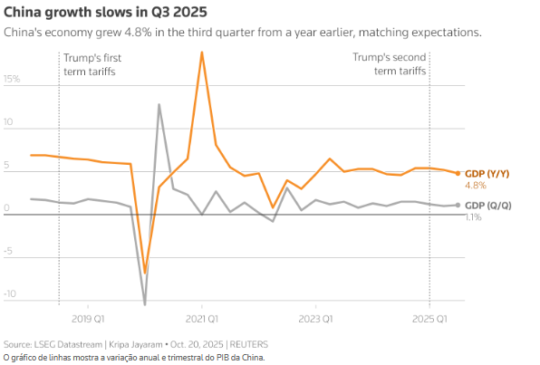 Pequim pode estar usando a manchete resiliência no crescimento como uma demonstração de força nas negociações entre seu vice-primeiro-ministro He Lifeng e o secretário do Tesouro Scott Bessent na Malásia nos próximos dias e em um possível encontro entre os presidentes Donald Trump e Xi Jinping na Coreia do Sul mais tarde.