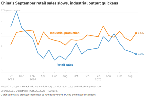 Enquanto a produção industrial cresceu para uma alta de três meses de 6,5% ano a ano em setembro, superando as previsões, as vendas no varejo desaceleraram para uma baixa de 10 meses de 3,0%.