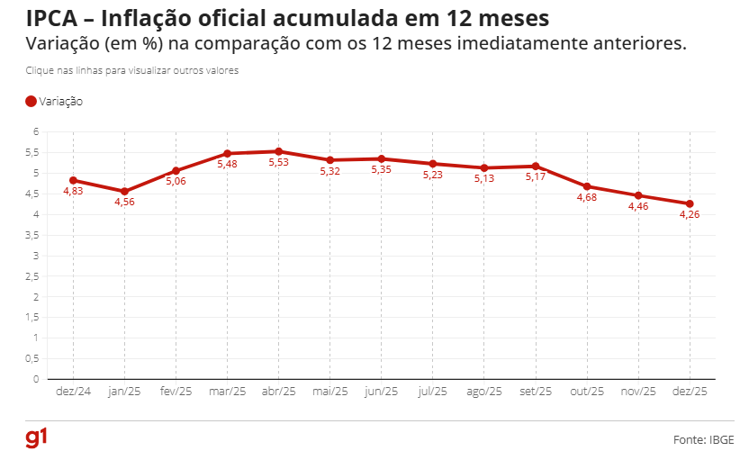 O Índice Nacional de Preços ao Consumidor Amplo (IPCA), considerado a inflação oficial do país, mostra que os preços subiram 0,33% em dezembro, segundo dados divulgados nesta sexta-feira (9) pelo Instituto Brasileiro de Geografia e Estatística (IBGE). Com isso, o indicador fechou em 4,26% em 2025.