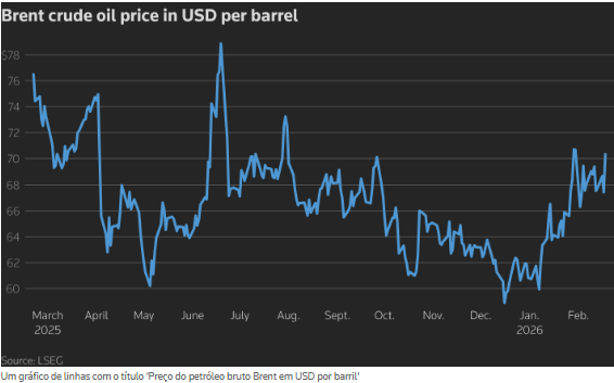 Os contratos futuros do Brent, referência global, subiram 4,4% na quarta-feira, fechando a US$ 70,35 o barril, o maior valor desde 30 de janeiro.