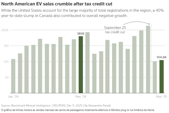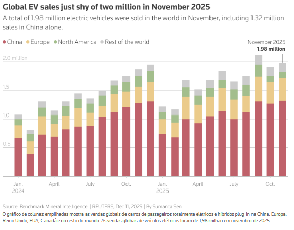 As vendas globais de veículos elétricos cresceram em novembro no ritmo mais lento desde fevereiro de 2024, com a China atingindo um platô, enquanto o fim de um programa de crédito fiscal para veículos elétricos nos Estados Unidos colocou a América do Norte a caminho de seu primeiro ano de declínio desde 2019, mostraram dados.