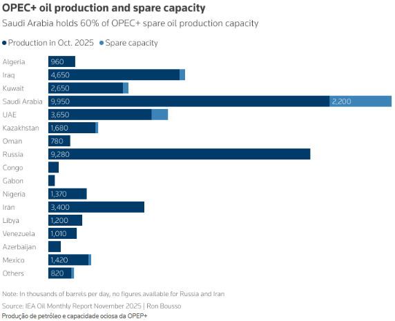 A Arábia Saudita, maior exportadora de petróleo do mundo, tem uma capacidade de produção de 12 milhões de barris por dia e, de longe, a maior capacidade ociosa do grupo, que atingiu 2,2 milhões de barris por dia em outubro, representando 60% da capacidade ociosa total da OPEP+, segundo a AIE (Agência Internacional de Energia). A companhia petrolífera nacional do país, Aramco, extrai petróleo a US$ 2 por barril , disse recentemente seu CEO, Amin Nasser, um dos preços mais baixos do mundo.