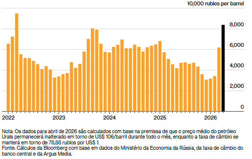 O aumento nos cofres russos é particularmente visível quando os preços são calculados na moeda local, já que a alta significa mais rublos por barril tributado. O preço médio do petróleo Urals em março subiu para 6.191 rublos, segundo cálculos da Bloomberg baseados em dados do governo que levam em consideração os números da Argus.