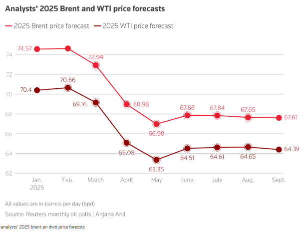 Uma pesquisa com 32 economistas e analistas realizada em setembro prevê que o petróleo Brent terá uma média de US$ 67,61 por barril em 2025, apenas 4 centavos abaixo da previsão do mês passado.