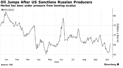 O Brent subiu mais de 5%, sendo negociado perto de US$ 66 o barril, caminhando para o maior salto desde o início do conflito entre Israel e Irã em 13 de junho. Os EUA colocaram na lista negra as gigantes petrolíferas russas Rosneft PJSC e Lukoil PJSC, gerando preocupações de que a Índia, importante compradora, abandonará as negociações com Moscou.