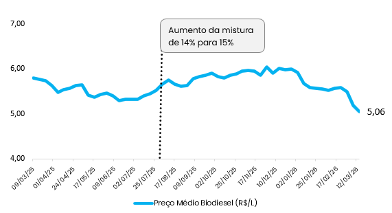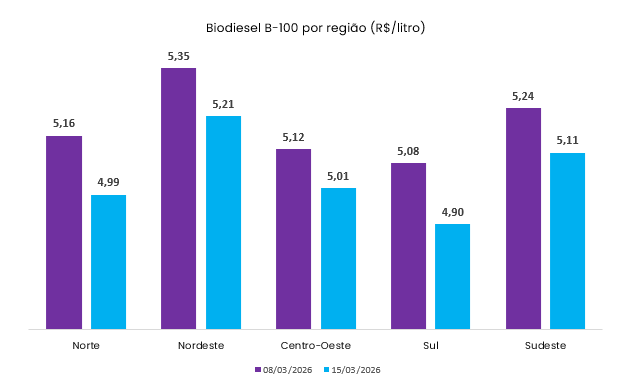 Os preços do biodiesel no mercado nacional apresentaram QUEDA de aproximadente 2,5%, na última semana (de 09/03/2026 a 15/03/2026). Na média Brasil, o produto negociado entre usinas e distribuidoras custou R$ 5,0558 por litro.