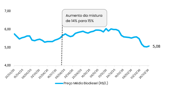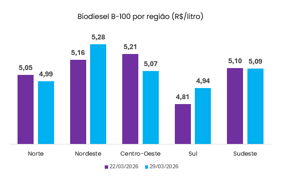 Os preços do biodiesel no mercado nacional apresentaram ALTA de aproximadamente 0,8%, na última semana (de 23/03/2026 a 29/03/2026). Na média Brasil, o produto negociado entre usinas e distribuidoras custou R$ 5,0776 por litro.
