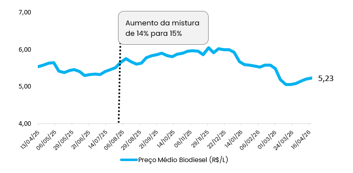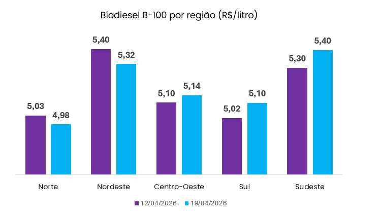 Os preços do biodiesel no mercado nacional apresentaram ALTA de aproximadamente 0,5%, na última semana (de 13/04/2026 a 19/04/2026). Na média Brasil, o produto negociado entre usinas e distribuidoras custou R$ 5,2306 por litro.