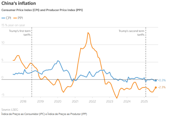 As pressões deflacionárias persistiram na China, com os preços ao consumidor e ao produtor caindo em setembro, apoiando o caso de mais medidas políticas, já que a queda prolongada do mercado imobiliário e as tensões comerciais pesam sobre a confiança.