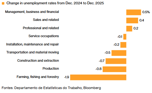 Os ganhos de janeiro, no entanto, concentraram-se principalmente nos setores de saúde e assistência social, tal como em 2025. Os empregos na construção civil também foram um dos principais impulsionadores do aumento, enquanto os setores de emprego predominantemente compostos por trabalhadores de escritório ficaram, em sua maioria, para trás.