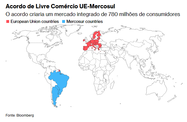 A Bloomberg Economics estimou que o acordo impulsionaria a economia do bloco Mercosul em até 0,7% e a da Europa em 0,1%. Geopoliticamente, isso também fortaleceria a presença da UE em uma região onde a China se tornou um grande fornecedor industrial e comprador de commodities.